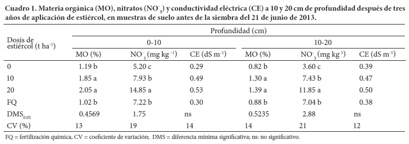 La concentración de MO en el suelo antes de la siembra (junio 2013) en el estrato de 0 a 10 cm de profundidad fue 1.19 % en el testigo y se incrementó en 0.86 unidades con la dosis mayor de estiércol (Cuadro 1), lo anterior debido a la aplicación anual de estiércol y a la incorporación al suelo de los residuos de cosecha (parte del tallo que queda a una altura de 10 cm de la superficie del suelo, después del corte), raíces, micro y macro organismos que quedaron después de la cosecha del maíz y avena de los años 2011 y 2012, respectivamente.