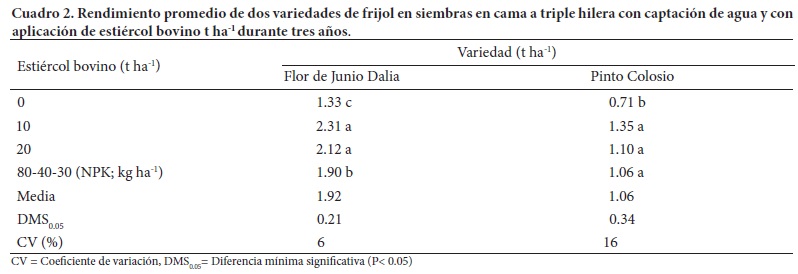 At the semi-arid region of the Centre-North of México, dry bean (Phaseolus vulgaris L.) is an important crop cultivated under rainfed conditions. Two varieties Flor de Junio Dalia and Pinto Coloso were evaluated in 2013 regarding the effect of the application of cattle manure on the grain yield of the two dry bean varieties: Flor de Junio Dalia (planted on June 21) and Pinto Coloso (on August 5), in triple row beds with in situ rainwater catchment under rainfed conditions. The system was used for the water catchment from "corrugation with Aqueel" and "tidge". Manure doses and chemical fertilizer were 0, 10 and 20 t ha-1 and 80-40-30 kg ha-1 N, P y K, applied annually for three consecutive years. Treatments showing higher grain yield were 10 and 20 t ha-1 of manure (2.3 and 2.1 t ha-1) with Flor de Junio Dalia and Pinto Coloso (1.4 and 1.1 t ha-1, respectively). Manure increased organic matter (OM) content in the first 10 cm of soil depth, and with 20 t ha-1 the soil showed the highest content of NO3- (14.85 mg kg-1; 0-10 cm layer).