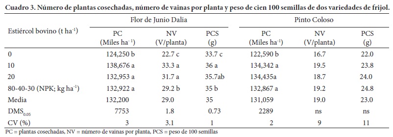 El número de vainas por planta y el peso de cien semillas presentaron la misma tendencia que el número de plantas cosechadas: los valores más altos ocurrieron en los tratamientos de estiércol de 10 y 20 Mg ha-1 y con fertilizante químico, y el valor menor en el testigo absoluto. En el presente estudio el número de vainas por planta y el peso de 100 semillas fueron indicadores para establecer diferencias entre tratamientos de abonos orgánicos. En relación con lo anterior, se ha demostrado que el rendimiento de frijol independientemente de la fecha de siembra depende en gran medida del balance nutrimental, principalmente de N y P (Magallanes-Quintanar et al., 2006).
