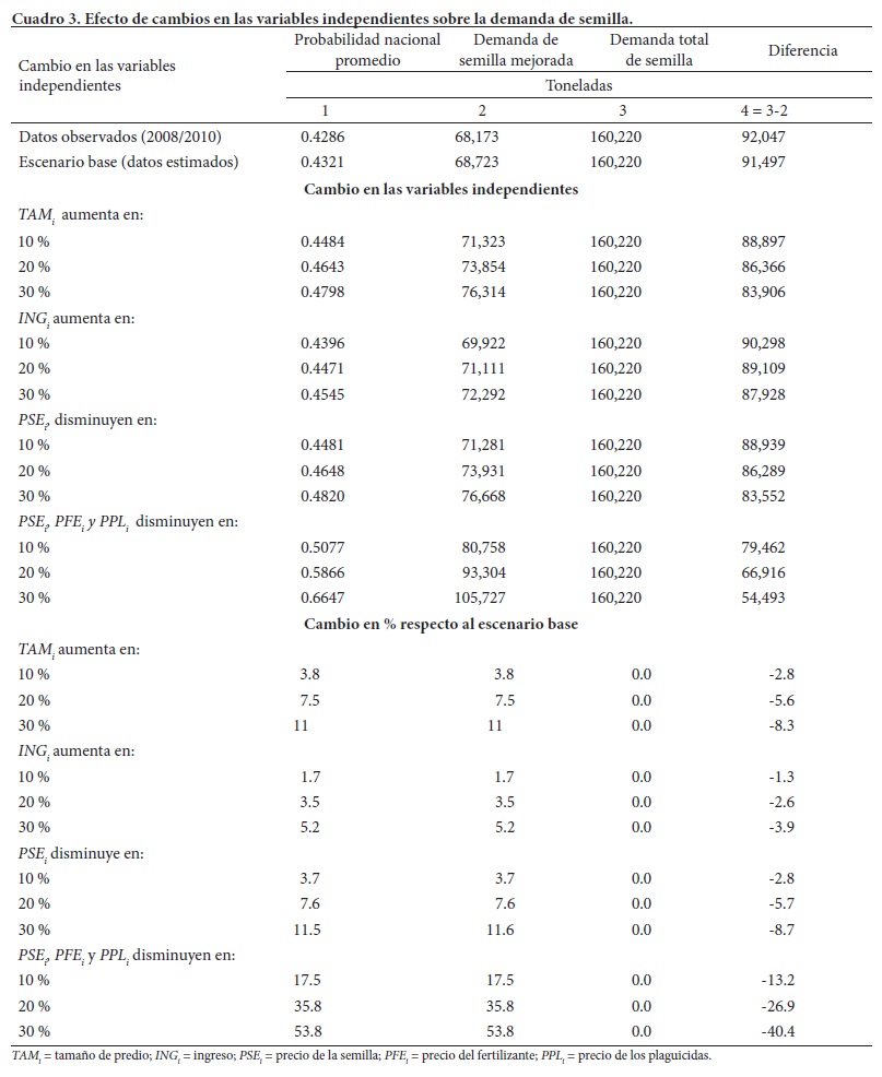 Para analizar la forma en que los cambios en las variables independientes afectan la tasa de utilización y la demanda de semilla mejorada, se plantearon los siguientes escenarios hipotéticos de aumento o disminución de las variables en 10, 20 y 30 %, para todas las regiones demandantes de semilla mejorada: 1) Aumento en el tamaño de predio; 2) Aumento en el ingreso por hectárea; 3) Disminución en el precio de la semilla mejorada; y 4) Disminución simultánea en el precio de los insumos (semilla mejorada, fertilizantes y plaguicidas).