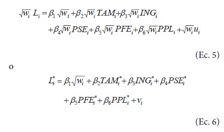 Anteriormente se mencionó que el término de perturbación de la Ecuación 4 es heteroscedástico. Gujarati y Porter (2010) señalan que dicho problema se puede resolver transformando cada variable de la siguiente manera: