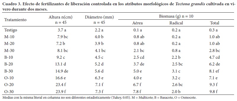 Las plantas de teca fertilizadas con Osmocote en dosis de 20 y 30 kg m-3 fueron más altas (23.4 y 23.9 cm), con mayor diámetro (7.1 y 7.3 mm), biomasa aérea (6.7 y 7.8 g) y biomasa total (9.3 y 9.8 g), que la mayoría de los demás tratamientos (Cuadro 3). Con respecto a la biomasa radical, los valores más altos (P < 0.05) se presentaron en las plantas de cuatro tratamientos: Basacote en dosis de 20 y 30 kg m-3 (2.5 y 3.1 g) y Osmocote a 10 y 20 kg m-3 (3.2 y 2.6 g) (Cuadro 3). Las plantas testigo presentaron los menores valores de altura y diámetro (3.7 cm y 2.2 mm). La biomasa aérea y radical del testigo y de los tratamientos de Multicote fueron también los más bajos en un intervalo de 0.1 a 2.1 g y de 0.2 a 0.8 g, respectivamente (Cuadro 3).