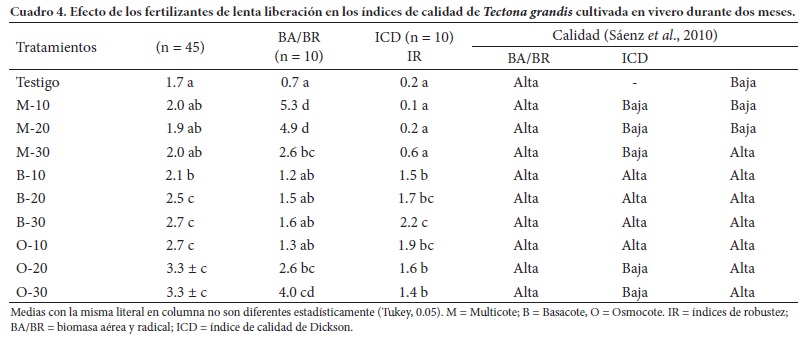 Las plantas de alta calidad de acuerdo al ICD (aquéllas con valores mayores de 0.5) resultaron de los tratamientos M-30, y las tres dosis de Basacote (B-10, B-20 y B-30) y Osmocote (O-10, O-20 y O-30); mientras que los tratamientos de baja calidad (con valores menores a 0.2) corresponden al testigo y a los tratamientos M-10 y M-20 (Cuadro 4).