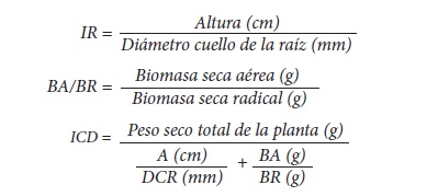 donde: A es la altura, en cm; BA es la biomasa seca aérea; DCR es diámetro del cuello de la raíz; BR es biomasa seca radical.