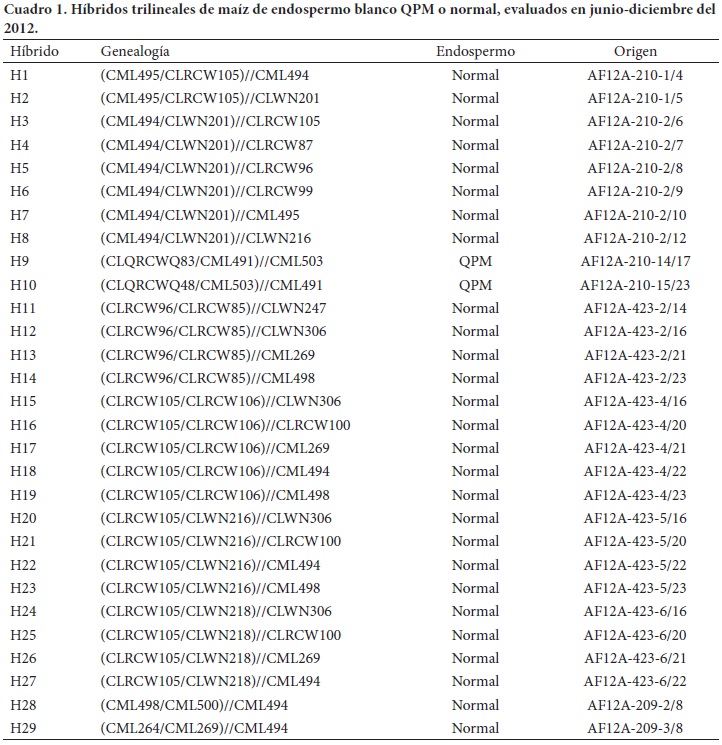 Se evaluaron 29 híbridos trilineales de endospermo blanco, dos con alta calidad de proteína (QPM), y 27 normales de maíz provenientes de líneas élite desarrolladas en el sub-programa Trópicos Bajos del Programa Global de Maíz del Centro Internacional de Mejoramiento de Maíz y Trigo (Cuadro 1). Los ensayos se establecieron en 15 localidades, tres de ellas en México y el resto distribuidas en 12 países de América Central, Norte de Sud-América (Cuadro 2), durante junio-diciembre de 2012.