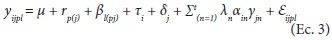 donde: yijpl comportamiento medio del genotipo i en ambiente j en la repetición p en el bloque l; μ = media general; rp(j) = efecto de la repetición p dentro del ambiente j; βl(pj) = efecto del bloque l dentro de la repetición p en el ambiente j; τi = efecto del i-ésimo genotipo; δj = efecto del j-ésimo ambiente; (τδ)ij = efecto de la interacción (G × A) del i-ésimo genotipo en el j-ésimo ambiente; εijpl es el error aleatorio no observable que se asume homogéneo con distribuciones normales e independientes, o sea, NID (0, I σ2) (σ2 = varianza del error aleatorio).