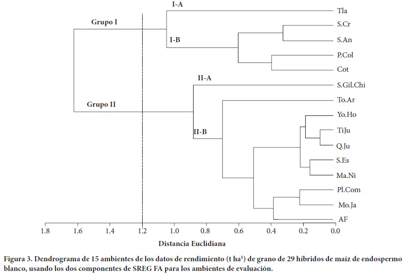 El análisis de conglomerados muestra los patrones ambientales de los marcadores para los Componentes 1 y 2 del modelo SREG FA. En el dendrograma de la Figura 3 se percibe el agrupamiento de los genotipos, que con un nivel de corte de 1.2 se aprecian dos grupos. En el Grupo I se observan dos subgrupos, el Subgrupo I-A que sólo alberga a la localidad de Tlatizapán como mayor discriminante de los híbridos, y en el Subgrupo I-B se ubican las localidades de Santa Cruz Porrillo; San Andrés; Palmira y Cotaxtla que presentan patrones diferentes de interacción pero en baja magnitud.