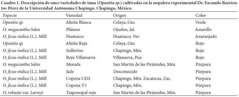 Frutos de once variedades de tuna (Cuadro 1) se recolectaron en el huerto experimental de nopal "Dr. Facundo Barrientos Pérez" de la Universidad Autónoma Chapingo entre julio y octubre de 2012, ubicado en Chapingo, Estado de México, en el Altiplano Central Mexicano a 19º 29' N y 98º 53' O, a 2240 m de altura. El clima es C(Wo) (w)b (i')g, templado moderado lluvioso, el más seco de los subhúmedos, con lluvias en verano, temperatura media anual de 17.8 ºC y 644 mm de precipitación anual.