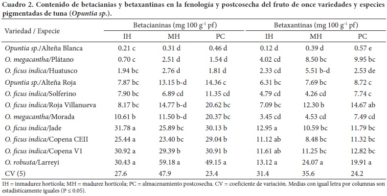 En la mayoría de las muestras la concentración de pigmentos se elevó durante el almacenamiento postcosecha, en contraste con lo ocurrido con las betacianinas y las betaxantinas en las variedades Plátano, Huatusco y Larreyi (Cuadro 2). Al respecto, Zegbe y Mena-Covarrubias (2010) indican que el aumento de la concentración de estos pigmentos en la mayoría de las variedades puede ser debido a un efecto de concentración por la pérdida de agua en postcosecha.