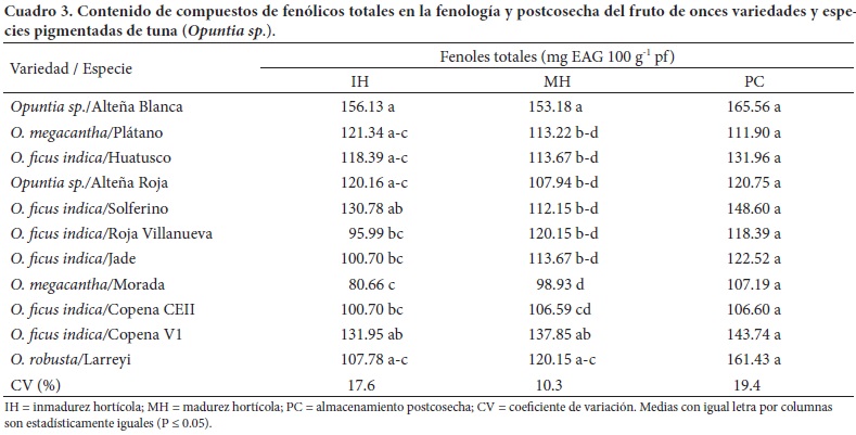 Las concentraciones de compuestos fenólicos aquí observadas en la pulpa de tuna son menores (98.93 a 153.18 y 107.19 a 165.56 mg EAG 100 g-1 pf, en los tratamientos MH y PC, respectivamente) a las descritas por Georgé et al. (2005) para frutos de lichies (Litchi chinensis), duraznos (Prunus persica) y fresas (Fragaria spp) (> 180 mg EAG en 100 g pf), y éstos a su vez son más bajos (> 250 mg EAG en 100 g pf) que en hortalizas como apio (Apium graveolens), alcachofa (Cynara scolymus) y col de Bruselas (Brassica oleracea var. Gemmifera).