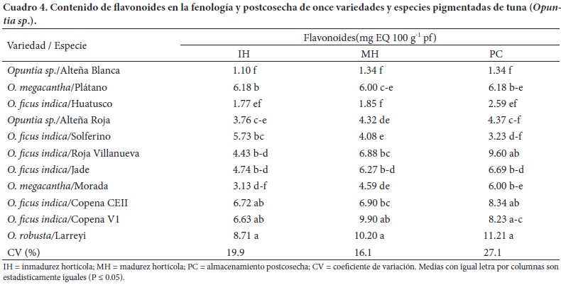 El intervalo de flavonoides aquí registrado fue inferior (1.10 a 11.21 mg EQ 100 g-1 pf) al reportado (9.5 a 37.4 mg EQ 100 g-1) por Chavez-Santoscoy et al. (2009) para nueve variedades de Opuntia spp. La concentración de flavonoides encontrada en todas las variedades fue menor a la de compuestos fenólicos totales, lo cual podría deberse a que algunos flavonoides se encuentran en forma de procianidinas (taninos condensados), como sucede en otros frutos (Cui et al., 2006). El contenido de procianidinas no se ha estudiado en tuna. Kuti (2004) y Fernández-López et al. (2010) identificaron a los flavonoides miricetina y luteolina, quercetina, isoramnetina y kaempferol en tuna, fitoquímicos que también se asocian con la actividad antioxidante.