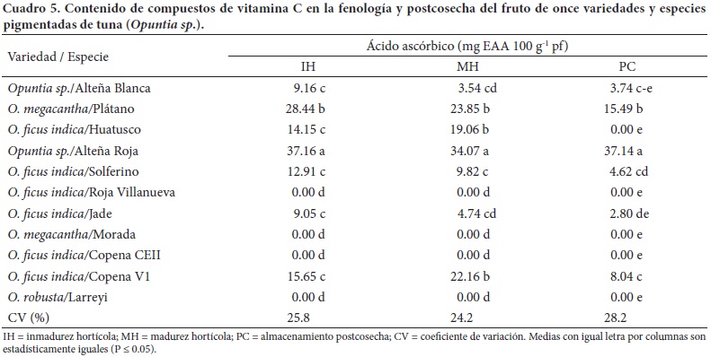 Entre etapas fenológicas, los niveles de ácido ascórbico en la mayoría de las variedades en inmadurez hortícola tendieron a ser decrecientes durante el proceso de maduración del fruto mientras que entre variedades las concentraciones mayores se registraron en las menos pigmentadas. En el jugo del fruto de dos cultivares O. ficus-indica y O. robusta, Stintzing et al. (2005) reportaron los niveles de 51.1, 70.2 y 67.9 mg L-1 para frutos blancos, anaranjados y rojos, respectivamente, y el mayor contenido (95.4 mg L-1) para frutos de color púrpura. Según El Gharras et al. (2008), el ácido ascórbico evita la degradación de betalaínas presentes en el jugo de tuna; no obstante la estabilidad de estos pigmentos disminuye durante el almacenamiento (Piga, 2004).
