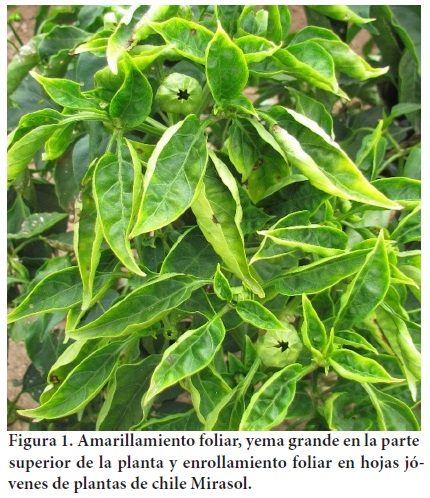 La sintomatología relacionada con la infección causada por fitoplasmas en las plantas de chile Mirasol analizadas fueron: amarillamiento foliar, yemas grandes principalmente en la parte superior de la planta, y enrollamiento foliar en las hojas más jóvenes; estos síntomas son diferentes a los reportados por Santos-Cervantes et al. (2008) en donde plantas de chile colectadas en los estados de Guanajuato y Sinaloa, México, las cuales mostraron síntomas asociados con ‘Ca. Phytoplasma asteris', como proliferación de brotes y hojas pequeñas.