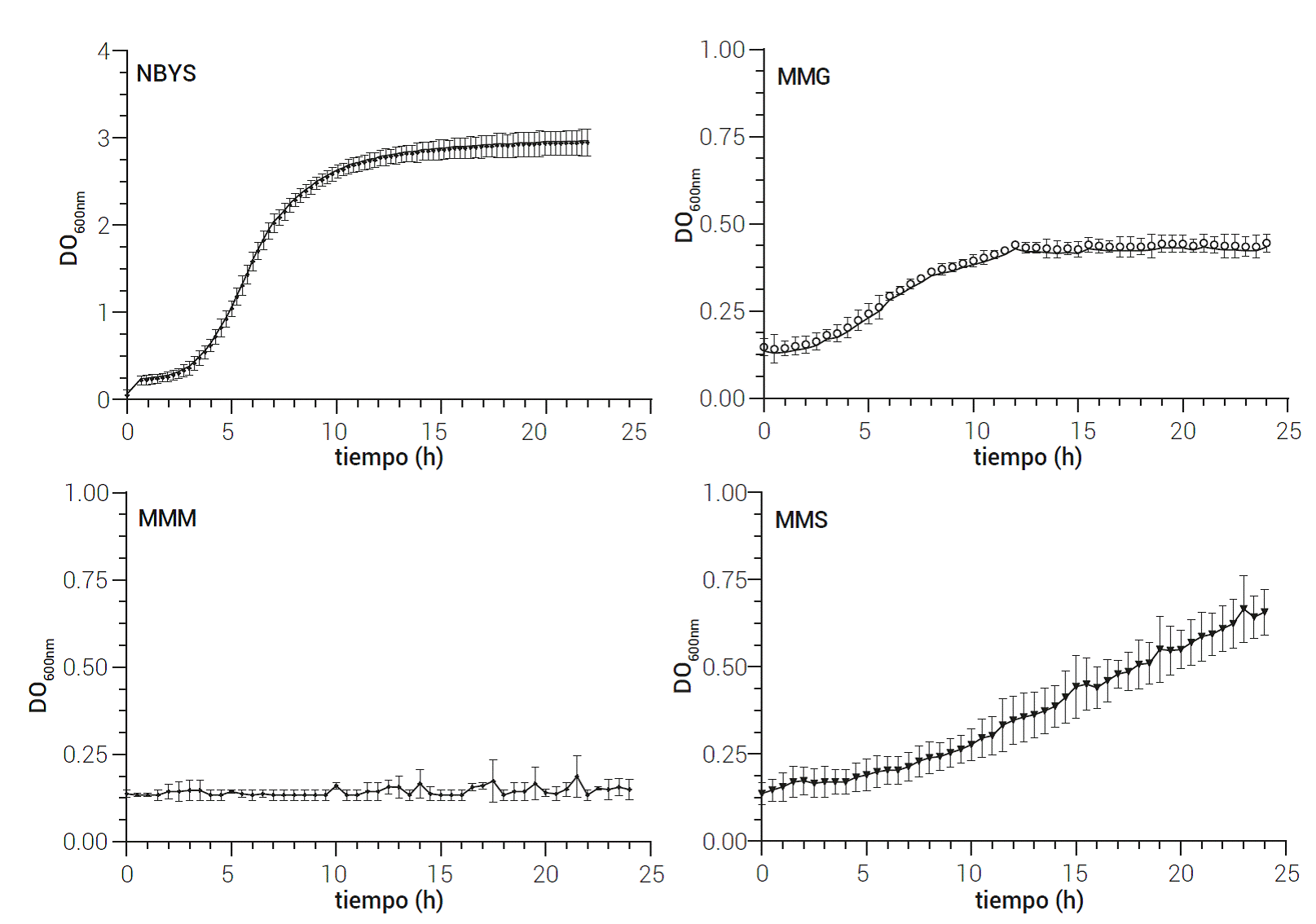 Figura 1 Crecimiento de R. solanacearum en distintas fuentes de carbono. NBYS: medio NBY con sacarosa, MMG: medio mineral con glucosa, MMM: medio mineral con maltosa, MMS: medio mineral con sacarosa. Los resultados mostrados son el promedio con la desviación estándar de tres experimentos independientes.