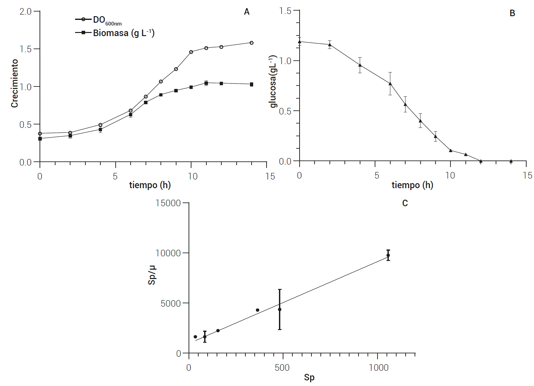 Figura 2 Crecimiento de la cepa RsJ0314 en cultivo por lote a un volumen de operación de 3.0 L. [A] Perfil de crecimiento en mg L-1 y DO600nm, [B] consumo de sustrato (mg L-1). [C] Diagrama de Langmuir para el cálculo de Ks. La ecuación de la recta es y = 9.155x + 960.2 con una R2 = 0.9389. En los gráficos se muestran el promedio y la desviación estándar de los datos obtenidos de dos experimentos independientes.