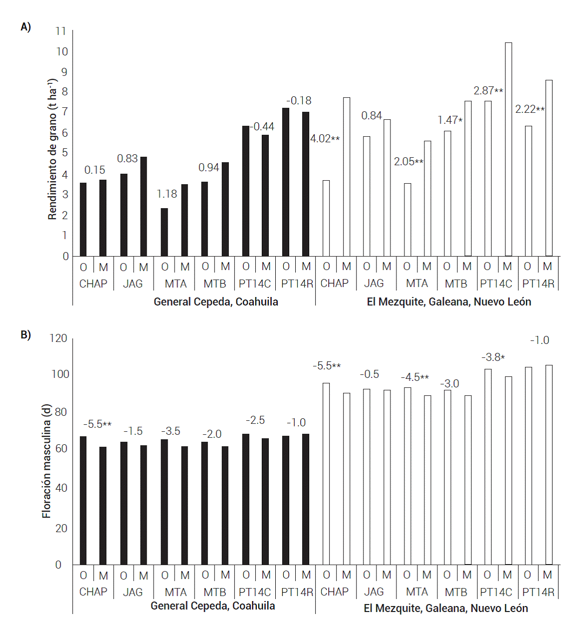 Figura 1 Interacción Variedades × Selección × Ambientes en el rendimiento de grano (A) y floración masculina (B) evaluados en 2022; O y M, versiones original y mejorado, respectivamente; CHAP, JAG, MTA, MTB, PT14C y PT14R son las variedades nativas en estudio; los valores entre O y M indican la diferencia (M - O); *, **: significativo P ≤ 0.05 y 0.01, respectivamente.