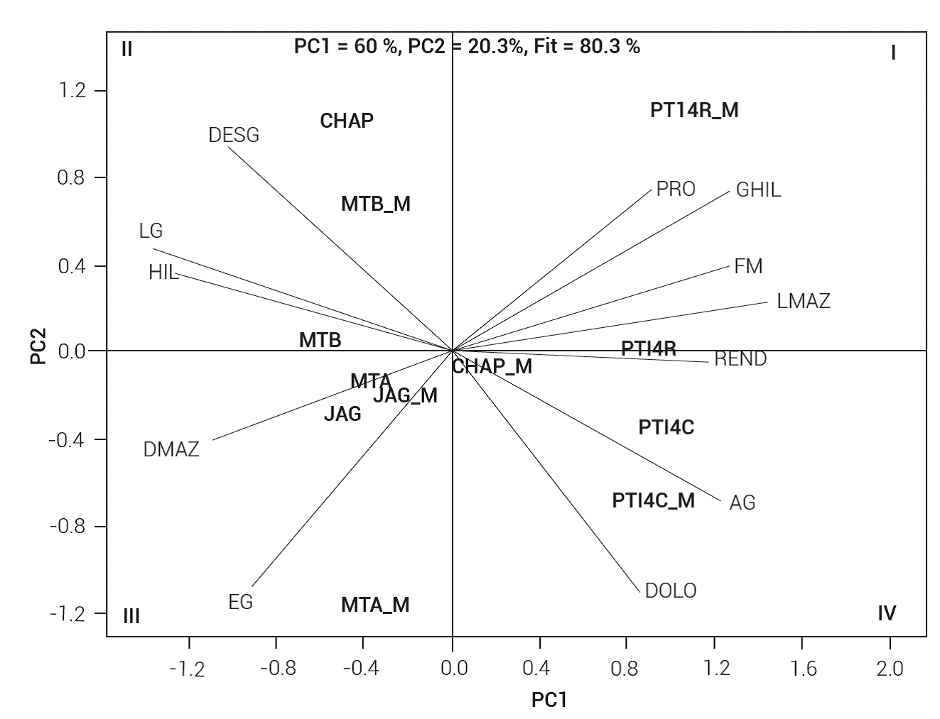 La Figura 2 explica el 80.3 % de la variación acumulada en los caracteres en estudio con base en los dos primeros componentes principales (PC1 y PC2) con 60.0 y 20.3 %, respectivamente. En esta figura, además de explorar la comparación relativa entre variedades, se puede analizar la relación entre los caracteres y la interacción variedades × caracteres, y de esta manera, las características particulares entre variedades (Yan, 2014). En el eje de la abscisa (Cuadrantes I y IV) se identifica el rendimiento de grano, asociado positivamente con PRO, FM, LMAZ y GHIL; asociado a estos caracteres se identifica, con valores positivos a las variedades PT14C y PT14R con rendimientos superiores, adaptadas a áreas intermedias, en tanto que las de menor rendimiento, las variedades de transiciónaltura (JAG, CHAP, MTA y MTB) se encuentran en los Cuadrantes II y III, cuya diferencia promedio en rendimiento es de 2.5 t ha-1(Cuadro 4); es decir, las variedades PT14C y PT14R se caracterizan por presentar buen potencial de rendimiento de grano (REND), con plantas prolíficas (PRO), son variedades más tardías, con mayor diámetro de olote (DOLO), longitud de mazorca (LMAZ) y número de granos por hilera (GHIL), e inversamente correlacionadas con el número de hileras (HIL), longitud (LG), espesor (EG) de grano y diámetro de mazorca (DMAZ), características que corresponden a las variedades procedentes de transiciónaltura (JAG, CHAP, MTA y MTB), resultados que se pueden verificar en el Cuadro 4. El número de hileras (HIL) en la mazorca, el diámetro del olote (DOLO) y la proporción grano/mazorca (DESG) son caracteres de utilidad para descripción de las variedades debido a que son menos influenciados por el ambiente, como se encontró en este estudio (Cuadro 2), el resto de los caracteres en el Cuadro 4, por lo general, son influenciados por el ambiente de evaluación (Olvera-Aguilar et al., 2023).