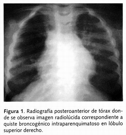 Ante la sospecha de malformación congénita del tipo quiste broncogénico se realizó intervención quirúrgica, encontrando lesión quística en lóbulo superior derecho de aproximadamente 2cm de diámetro intraparenquimatoso, con pared delgada, con aire en su interior y conectado a la vía aérea.