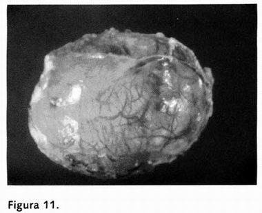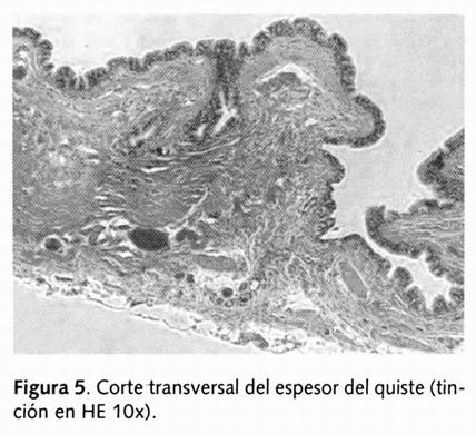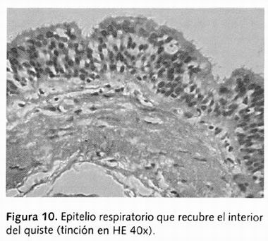 Histológicamente, el QB es de pared delgada cuando no está infectado, está compuesta por epitelio columnar ciliado; la pared también puede contener cartílago, músculo liso, glándulas bronquiales y tejido nervioso 8 . El contenido del quiste varía de un líquido claro hasta del de material mucoso (Figuras 11 y 12).