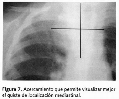 Cuando el quiste es de localización mediastinal se observa en la radiografía de tórax como masa hiliar o mediastinal, de bordes lisos y pared bien definida. Los de localización parenquimatosa se visualizan principalmente en lóbulos inferiores en el 75% de los casos. El diámetro promedio es de 2 a 4cm, y generalmente permanece sin incrementar su tamaño, al menos que se agregue un proceso infeccioso por lo que pudiera observarse un nivel hidroaéreo.