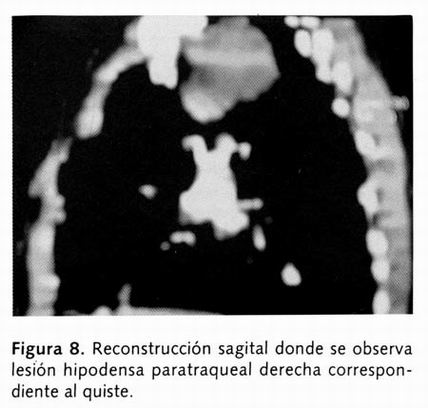 A su ingreso presentó T 37.2°C, FC 123x', FR 34x', saturación a través de oximetría de pulso del 92% con un FiO2 de 21%. Edad aparentemente igual a la cronológica, orientado, bien conformado, datos de dificultad respiratoria caracterizados por retracción supraesternal y disociación toracoabdominal. Al realizarle auscultación de tórax presentó algunos estertores gruesos, el resto de la exploración sin alteraciones. Se le realizó radiografía de tórax observando ensanchamiento mediastinal secundario a lesión radioopaca, redondeada, de contornos lisos y bien definidos, con base de implantación mediastinal, signo de silueta positivo, con localización paratraqueal derecha (Figuras 6 y 7); en la reconstrucción sagital de tomografía se confirma dicha situación (Figura 8).