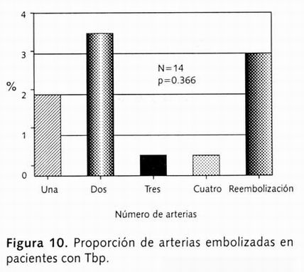 La proporción de arterias embolizadas en el grupo de pacientes con Tbp (Figura 10), y en el otro grupo constituido por otras enfermedades diferentes a la Tbp no fue diferente (p=0.715, χ2 =0.133).