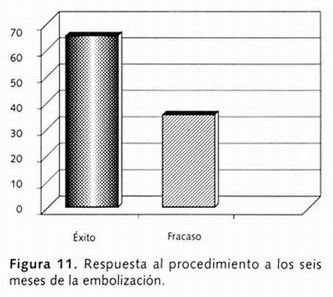 La proporción de pacientes que tuvo éxito clínico a los 6 meses al tratamiento de embolización fue del 66.6%. Estas diferencias no fueron estadísticamente significativas (p= 0.095, χ2 = 2.793), (Figura 11).