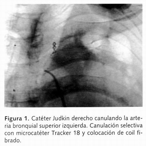 La embolización de las arterias bronquiales se realizó a través de catéter 6 Fr de diferente configuración (Cobra, Headhunter-1, Newton, Simmon´s-1) y supraselectivización con microcatéter coaxial Tracker - No. 18 (Infusion catheter w/Hydrolene Medi-Tech Target. Boston Scientific). Se emplearon partículas de alcohol polivinilo (PVA) de diferente diámetro 150-500 micras (Target Therapeutics. Boston Scientific). En 23 pacientes utilizaron además "microcoils" para el cierre de la arteria proximal, colocado por medio de microcatéter Tracker-18 y coil pusher. Una vez identificada la arteria responsable del sangrado se embolizó sistemáticamente con partículas de PVA de acuerdo con el calibre del vaso. Cuando el tamaño y morfología del vaso lo permitieron, y la posición del catéter resultaba adecuada, se embolizó con microcoils Vortx tipo diamond shape (Target Therapeutics. Boston Scientific. 2x3x22, 2x4x42, 2x5x60) (Figura 1).