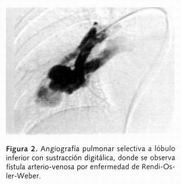 Únicamente se realizó estudio angiográfico en 6 pacientes, de cirugía de resección pulmonar fueron 2, no quirúrgicos con diagnóstico de cáncer broncogénico 4, secuestro pulmonar y fístula AV 2 (enfermedad de Rendu-Osler-Weber), (Figura 2).