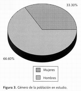 El 66.6% de esta población estuvo constituida por hombres y el restante 33.4% por mujeres, p=0.001, χ2 =10.8, (Figura 3). En cuanto a la edad, se atendieron niños desde los 2 años hasta pacientes de 77 años, por lo que se estratificó a la población de estudio en dos grupos: menores de 20 años (6 pacientes) y los que tenían 20 años o más (24 pacientes), encontrando diferencia significativas de p=0.006, χ2 =3.33.