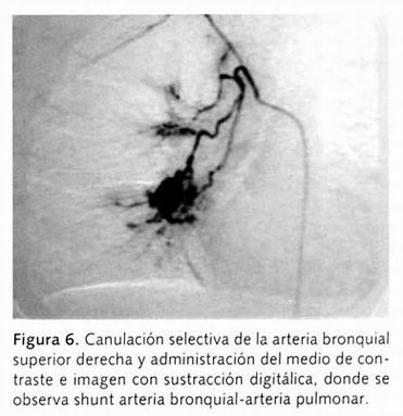 Results: Bronchial hipervasculature, contrast medium leakage, bronchial-pulmonary artery shortcut and dilatation of bronchial artery embolization were seen in 82.3% of the cases during the first week and 66.6% after 6 months follow-up. Three patients needed multiple embolization and 6 patients needed surgery to control bleeding.