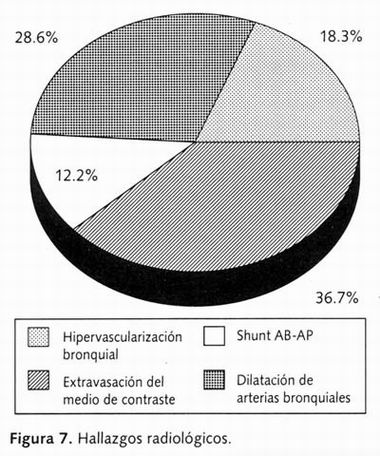La extravasación del medio de contraste (36.7%), dilatación y tortuosidad de vasos bronquiales (28.6%), vasos de neoformación provenientes de la aorta —hipervascularización— (18.3%) y cortocircuito arteria bronquial-arteria pulmonar (12.2%). La extravasación de medio de contraste fue en 18 casos ( 62%),