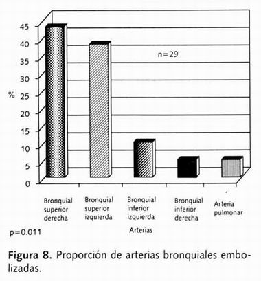 Los casos de dilatación y tortuosidad de arteria bronquial e hipervascularización fueron los que requirieron 2 ó 3 sesiones de embolización; en nuestro grupo fue de 16.6%.