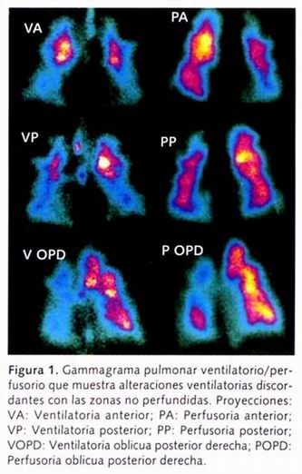 En nuestra paciente, sin enfermedad previa, la relación causa-efecto entre el procedimiento y la aparición del deterioro clínico es muy evidente. En un principio la sintomatología respiratoria obligó a pensar en tromboembolia pulmonar, ya que el gammagrama pulmonar V/Q fue reportado como positivo. Sin embargo, este gammagrama pulmonar V-Q no es concluyente de TEP, ya que al comparar las imágenes de la fase ventilatoria con la perfusoria, los defectos no corresponden, aunque podemos observar la afectación generalizada de ambas fases, lo que podría estar en relación con un proceso pulmonar severo, como el que se ve en edema pulmonar (Figura 1).