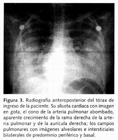 La radiografía anteroposterior (AP) del tórax mostró la silueta cardiaca en gota, el cono de la arteria pulmonar convexo, aparente crecimiento de la rama derecha de la arteria pulmonar y de la aurícula derechas; los campos pulmonares con imágenes alveolares e intersticiales bilaterales, sugestivas de edema pulmonar (Figura 3).