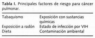 Los factores de riesgo para el cáncer pulmonar son diversos (Tabla I), pero destacan: tabaquismo, tanto activo como pasivo 15 ; exposición a radiación por gas radón 16 ; dieta 17 ; exposición a compuestos químicos como asbestos 18 , arsénico, cloruro de vinilo, cromato de níquel 19 , clorometilo de éter 20 , entre muchas otras sustancias más; género sexual 21 ; estado de infección por VIH 22 ; contaminación ambiental 23 ; contacto con construcciones navales 24 , etcétera. En el cáncer de células pequeñas como en el de células escamosas, la aparición del cáncer se asocia frecuentemente con fumadores, tanto activos como pasivos.