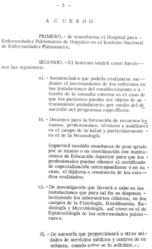 La crítica es un fenómeno sustancial de la creación; de hecho, hay quien piensa que crítica y creación son la misma cosa; toda creación está sujeta a la crítica. En la historia del INER, su creación necesariamente llevó a la crítica de algunos grupos médicos en su momento; en 1975, el acuerdo por el que se transforma el Hospital para Enfermos Pulmonares de Huipulco en el Instituto Nacional de Enfermedades Pulmonares atrajo críticas. Sin embargo, esa definición política trajo también un gran beneficio a la sociedad mexicana, y se inició un proyecto asistencial y de investigación a fin de formar recursos humanos profesionales técnicos y auxiliares en el campo de la salud y, particularmente, en el de la neumología. El secretario Jiménez Cantú, en ejercicio de sus facultades, acuerda así la primera etapa de un Instituto fundamentado en una valiosa época construida por hombres de gran visión y trascendencia en la medicina mexicana. Ellos cimentaron sólidamente el origen de nuestro Instituto; en la mesa de honor están las personas que, como símbolo humano, han dado origen a la Institución.
