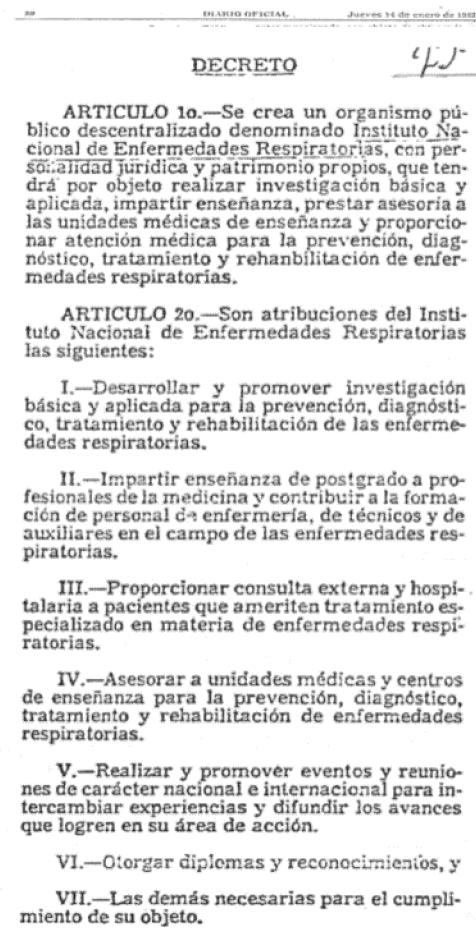 El jueves 14 de enero de 1982 se creó un organismo público descentralizado denominado Instituto Nacional de Enfermedades Respiratorias con personalidad jurídica y patrimonio propios. Fue durante la misma época de la nacionalización de la Banca, se desarrollaba la Guerra de las Malvinas y Gabriel García Márquez era galardonado con el Premio Nobel.