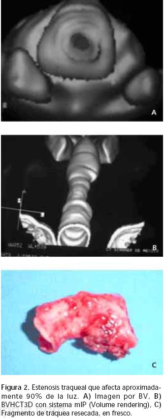 La BVHCT3D permite detectar espacialmente (3D) la extensión de la estenosis desde la laringe hasta los bronquios principales y tobares, no es un método invasivo, es de costo elevado y requiere un equipo de imagen altamente especializado. La FB detecta la presencia de estenosis, su grado con respecto a la luz de la vía aérea y las alteraciones endoluminales con gran precisión, es de bajo costo y al igual que la BVHCT3D requiere operadores bien entrenados en su metodología.