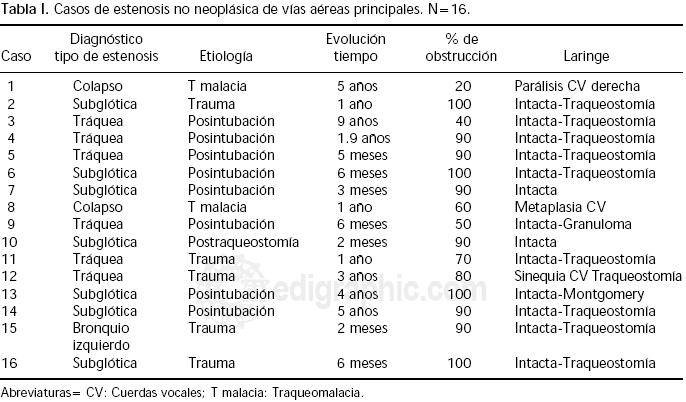 Se estudiaron 16 casos consecutivos con obstrucción no neoplásica de vía aérea principal: 7 estenosis subglóticas 4 estenosis traqueales 1 estenosis de bronquio principal izquierdo, 2 colapso de tráquea por traqueomalacia y 2 con granulomas endotraqueales posintubación. Al ingreso 10 casos tenían cánula de traqueostomía y uno un dispositivo de Montgomery (Tabla I).