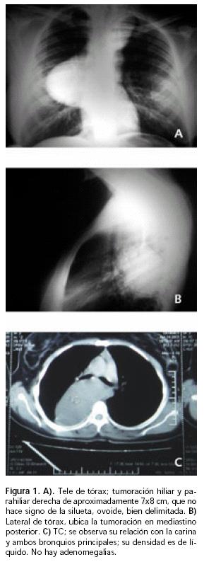 Mujer de 32 años; cuatro meses antes presentó tos con expectoración verde que cedió con antibióticos en dos semanas; las radiografías de tórax mostraron tumoración posterior en hemitórax derecho que se confirmó por TC (Figura 1).