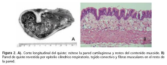 Se realizó toracotomía posterolateral derecha, encontrando un quiste de paredes cartilaginosas, duras, poco vascularizado, contenido mucoide espeso café oscuro, mediastinal, naciendo aparentemente de la carina traqueal, en contacto con ambos bronquios, y que penetraba al hemitórax izquierdo en un trayecto de aproximadamente 5 cm. Se resecó en su totalidad, sin complicaciones y egresó del hospital dos días después; se le encontró en buenas condiciones tres semanas después (Figura 2).