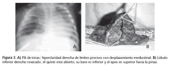Lactante masculino de ocho meses con cuadros infecciosos respiratorios repetitivos desde el segundo mes; el último ameritó ingreso al hospital por insuficiencia respiratoria y secreciones bronquiales amarillentas abundantes. Se le tomó radiografía de tórax PA en la que se observó imagen radiolúcida, bien circunscrita, ovoide, que ocupaba el 50% de la cavidad torácica, predominantemente inferior, con moderado desplazamiento del mediastino hacia el lado izquierdo (Figura 3A). Se practicó toracotomía posterolateral derecha, encontrándose lóbulo inferior muy aumentado de volumen, el cual fue resecado sin complicaciones (Figura 3B). Egresó al tercer día posoperatorio y seguía en buenas condiciones siete días después. Patología reportó quiste broncogénico intraparenquimatoso.