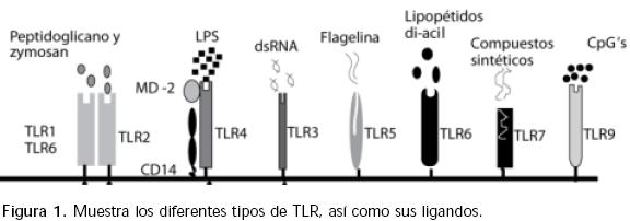 Algunos componentes propios de la respuesta inmune pueden servir de ligandos para los TLR de las células epiteliales del tracto respiratorio, tal es el caso de la proteína surfactante tipo A (SPA), la cual también es capaz de activar macrófagos alveolares vía TLR4 e inducir la producción de IL8 en las células epiteliales15,16. Los péptidos antimicrobianos βdefensina2 murina (mBD2) y LL37, son otro ejemplo claro de activación vía TLR. Este tipo de péptido antimicrobiano puede activar células dendríticas inmaduras vía TLR4, dando como resultado un aumento de moléculas coestimulatorias y la maduración de la célula dendrítica17,18.