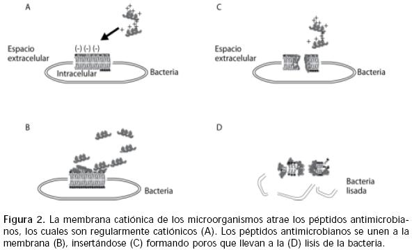 Las moléculas que tienen un efecto microbicida directo son principalmente los péptidos antimicrobianos, de bajo peso molecular (34.5 kD) y son principalmente catiónicos2123; tienen un amplio espectro en contra de bacterias Gram positivas, Gram negativas, hongos y virus envueltos23,24. Los péptidos, por su carga positiva, son atraídos por la membrana del microorganismo que regularmente tiene carga negativa. La unión de los péptidos con la membrana ocasiona que se aglutinen formando poros en la membrana del microorganismo, llevando así a su lisis2224 (Figura 2). Los péptidos antimicrobianos son sinérgicos con moléculas de defensa, tales como la lisosima y la lactoferrina24. De acuerdo con su estructura, existen varias clasificaciones de este tipo de péptidos antimicrobianos24; hay dos tipos muy importantes en el tracto respiratorio, las catelicidinas y las defensinas. Estos péptidos son producidos principalmente por las células epiteliales y por algunas células fagocíticas19,24,25; en su mayoría son inducibles, el estímulo puede ser por citocinas proinflamatorias como TNFα e IL1, PAM u otro tipo de péptidos antimicrobianos como catelicidinas26,27, pero también existen aquellos que son sintetizados constitutivamente como es el caso de la βdefensina1. Se ha observado que en algunas enfermedades de pulmón como fibrosis quística, neumonía infecciosa, bronquitis crónica, sarcoidosis y fibrosis pulmonar idiopática, los niveles de defensinas están claramente aumentados, lo que indica que son inducibles y están involucradas dentro de la inmunopatogénesis de varias enfermedades; tal es el caso de la neumonía causada por Pseudomonas aeruginosa donde se ha visto que se incrementa la cantidad de βdefensina2 en el lavado bronquiolo alveolar; además, se observó que este tipo de bacteria es susceptible a la acción bactericida de este tipo de defensina26. En enfermos con fibrosis quística, la alta cantidad de NaCI en pulmón de estos pacientes inactiva las defensinas de éste debido a la carga del NaCI, misma que da lugar a una infección por Pseudomonas muy difícil de controlar; inclusive, cuando hay una gran cantidad de anticuerpos circulantes en contra de Pseudomonas aeruginosa, la neumonía progresa hasta sus últimas consecuencias al estar inactivas las defensinas28.