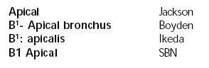 La nomenclatura segmentaria del árbol bronquial ha sido sistematizada por varios autores. Jackson y Huber1 dan un nombre para cada segmento, Boyden2 agrega un número en superíndice, Ikeda3 emplea latín para cada segmento y numera en superíndice y Córtese y Prakash4 anotan cada segmento con la sigla S, un número y el nombre de Jackson (Standard Bronchial Nomenclatura. SBN). Estas clasificaciones frecuentemente se mezclan confundiendo los nombres de los segmentos5. Por ejemplo, el segmento apical del pulmón derecho de Jackson y Huber de acuerdo con otros autores se denomina: