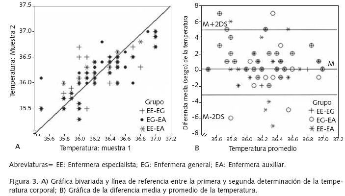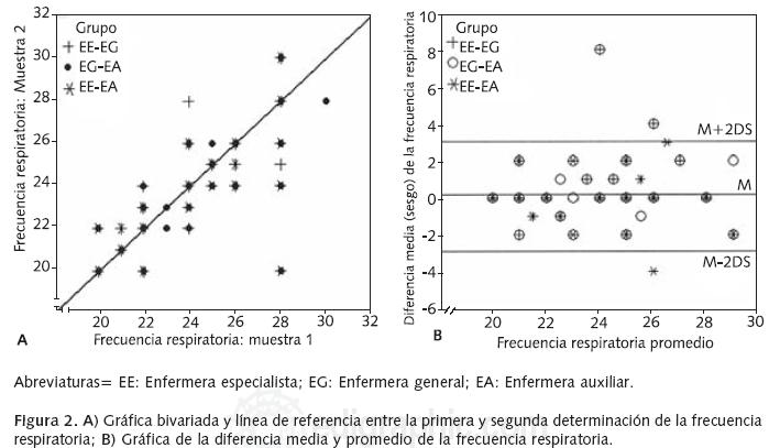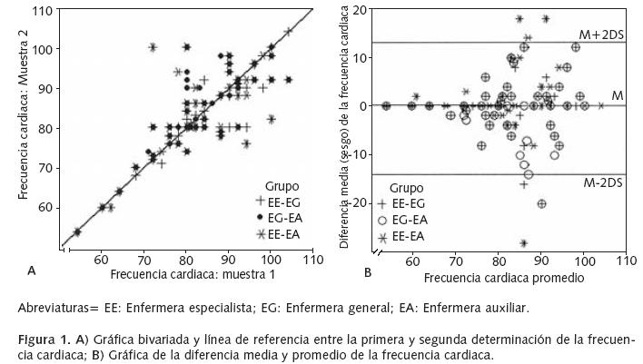 Methods: Twenty seven nurses measured the vital signs of 54 patients with stable respiratory diseases. The nurses were blinded to the study's objective. Concordance was determined between three groups of nurses from the INER Ismael Cosío Villegas, with different rank and academic background (specialist, general, auxiliary); we used the interclass correlation coefficient and the BlandAltman approach; p < 0.05 was considered as statistically significant.
