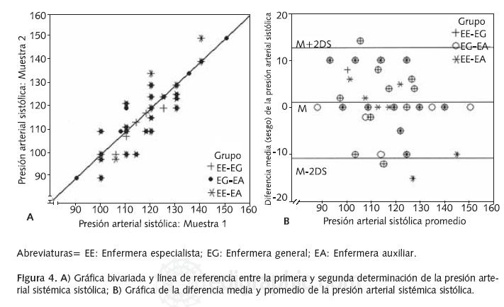 Análisis de los datos: éstos se expresan en frecuencias y porcentajes para las variables nominales dicotómicas, promedios y desviaciones estándar (M ± DE) para las variables numéricas. Para la diferencia de edades entre los géneros, utilizamos una prueba "t" para grupos independientes. Para los SV obtenidos por los diferentes grupos de enfermeras se utilizó ANOVA de muestras repetidas con ajuste de Bonferroni para las diferencias entre grupos. El coeficiente de correlación intraclase (CCI) y su intervalo de confianza al 95% respectivo, se utilizó para calcular la magnitud del acuerdo entre observadores. Para evaluar el acuerdo entre los grupos diferenciales de enfermeras (EEEG, EGEA y EEEA) se utilizó el procedimiento descriptivo de BlandAltman7. Una p < 0.05 fue considerada significativa.