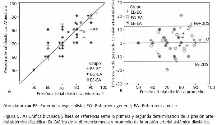 La descripción de BlandAltman del acuerdo entre los SV obtenidos por los grupos diferenciales de enfermeras se señala en la Tabla III. El comportamiento entre la primera y segunda medición de los SV en los tres grupos diferenciales de enfermeras se exponen en las gráficas bivariadas 1 a a 5a; la diferencia media (sesgo), y el promedio de cada uno de los SV se mencionan en las Figuras 1b 5b. (fig.2, fig.3, fig.4)