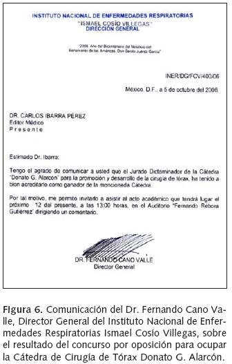 En nuestro Instituto Nacional de Enfermedades Respiratorias Ismael Cosío Villegas, la imagen y la historia del Maestro Alarcón perviven no sólo en las mentes de los más viejos de la comarca, en la de sus alumnos y en la de algunos de los alumnos de sus alumnos. Un tributo muy merecido a su memoria es el que la unidad de cirugía lleve su nombre, unidad que es la más laboriosa de las unidades de cirugía de tórax de México y de muchos países del mundo; ahora, el Cuerpo Directivo del INER Ismael Cosío Villegas, en una decisión que lo enaltece, ha decidido agregar otro sello de oro instaurando la Cátedra de Cirugía de Tórax que lleva su nombre, para la enseñanza, desarrollo y promoción de la cirugía de tórax, honor que se gana concursando por oposición (Figura 6). El nombramiento me llena de orgullo y me compromete aún más con ésta que ha resultado ser para mí una casa acogedora, llena de oportunidades y retos para seguir haciendo lo que considero hacer muy bien: Dar servicio, compartir, enseñar, y entregarme al cien por ciento. Para ello, ya marchan adelantadas varias de las acciones fundamentales que propuse como Plan de Trabajo para ocupar la cátedra, que se podrán llevar a cabo con el apoyo de todos ustedes: